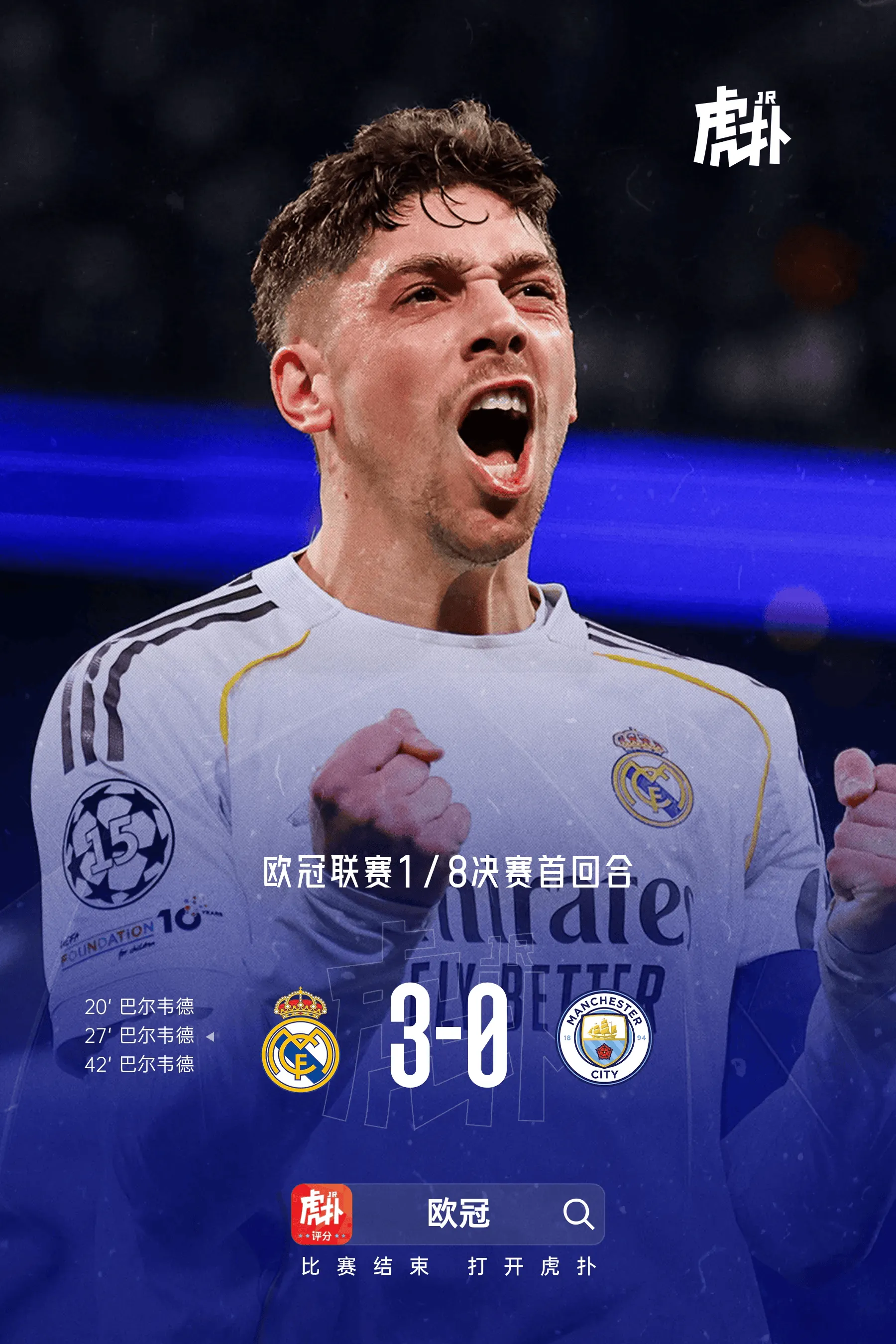 虎扑03月12日讯 欧冠1/8决赛首回合,皇马主场3-0击败曼城。